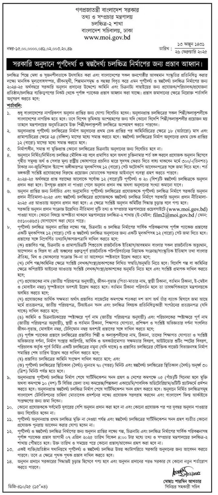 বিজ্ঞপ্তিতে আরও বলা হয়েছে, অনুদানের জন্য আবেদন করতে পারবেন শুধু দেশীয় নির্মাতা ও প্রযোজকেরা।