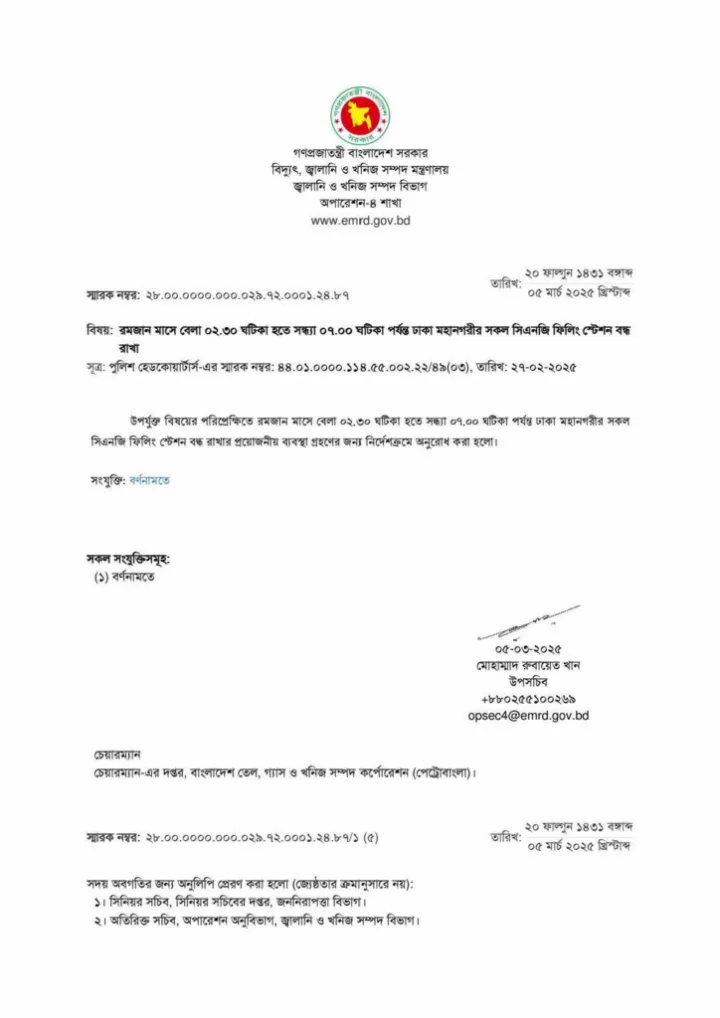 এতে বলা হয়, রমজান মাসে বেলা ২টা ৩০ মিনিট থেকে সন্ধ্যা ৭টা পর্যন্ত ঢাকা মহানগরীর সকল সিএনজি ফিলিং স্টেশন বন্ধ রাখার প্রয়োজনীয় ব্যবস্থা গ্রহণের জন্য নির্দেশক্রমে অনুরোধ করা হলো।